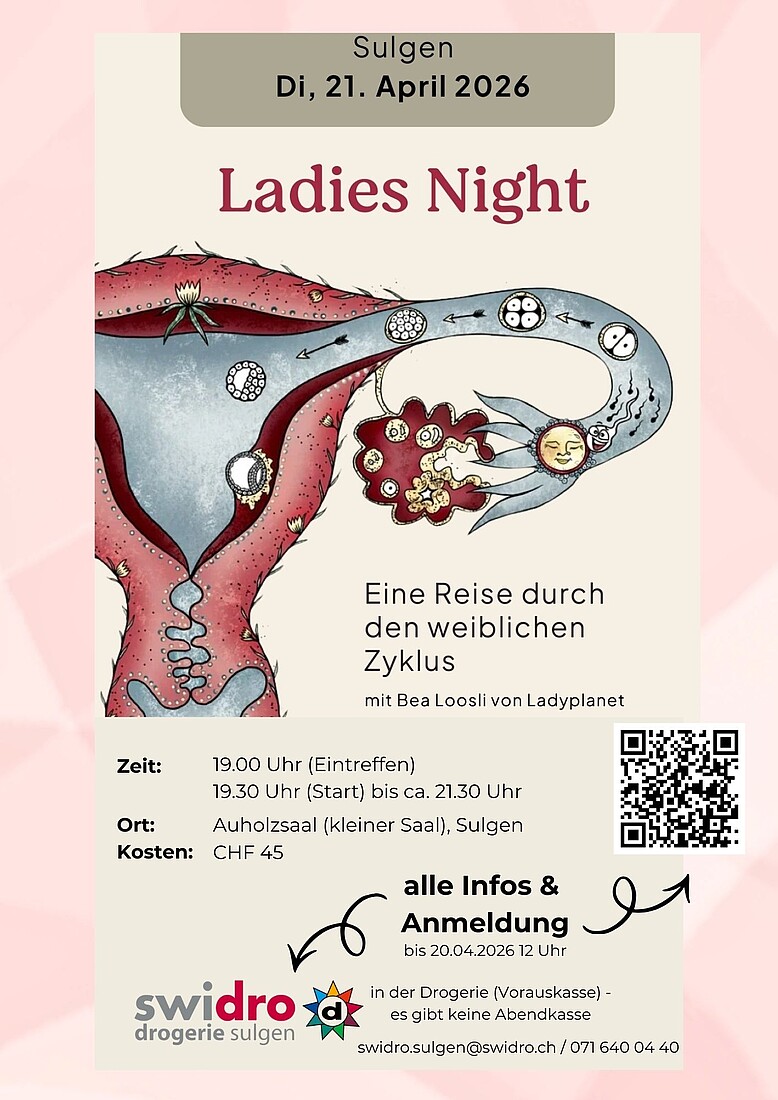 Ladies-Night: Eine Reise durch den weiblichen ZyklusEin informativer und humorvoller Abend rund um Pubertät, Verhütung, PMS, Lust und Wechseljahre – begleitet von Sexualpädagogin Bea Loosli (ladyplanet.ch).
